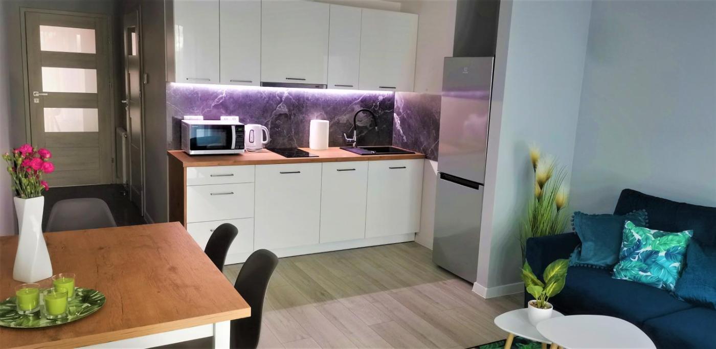 Apartament z 1 sypialnią. The well-equipped kitchenette features a stovetop, a refrigerator, a dishwasher and kitchenware. The apartment provides a washing machine, a private entrance, soundproof walls, a flat-screen TV with cable channels, as well as garden views. The unit offers 4 beds. Apartament - 5 osobowy. Powierzchnia pokoju ok.: 50 mkw.